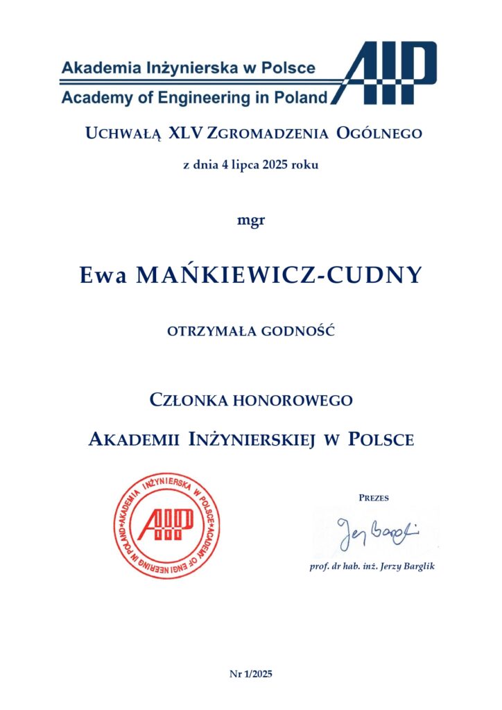 Akademia Inżynierska w Polsce rzadko nadaje swym członkom godność członka honorowego. Przypomnijmy, że jeszcze przed II wojną światową członkiem honorowym Akademii Nauk Technicznych został prof. inż. Ignacy Mościcki, prezydent RP w latach 1926–39. Prezes FSNT-NOT Ewa Mańkiewicz-Cudny została pierwszą kobietą wyróżnioną tą godnością. Pani Prezes i Panom Profesorom należą się serdeczne gratulacje i podziękowania za znakomitą działalność.